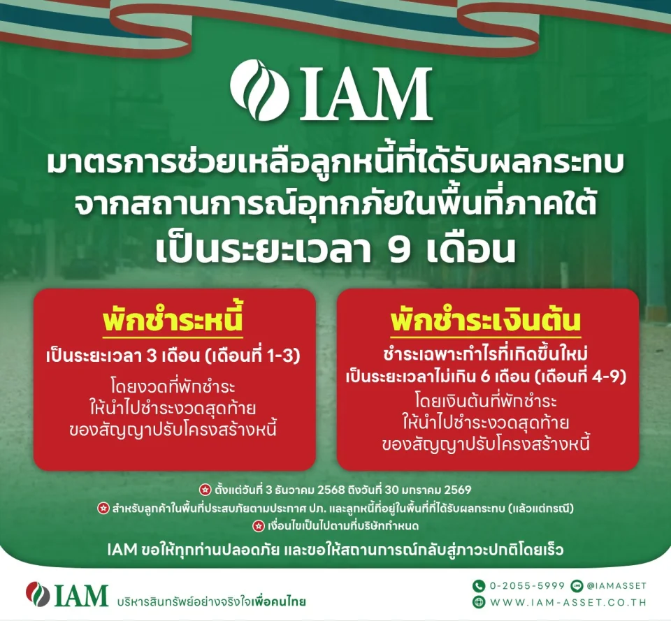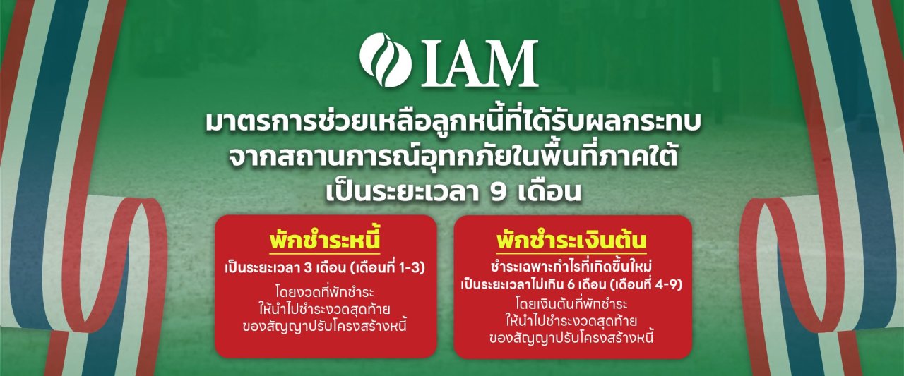 เพื่อบรรเทาความเดือดร้อนให้แก่ลูกหนี้ที่ได้รับผลกระทบจากสถานการณ์อุทกภัย IAM จึงออกมาตรการช่วยเหลือลูกหนี้ที่ได้รับผลกระทบจากสถานการณ์อุทกภัยเป็นระยะเวลา 9 เดือน ดังนี้